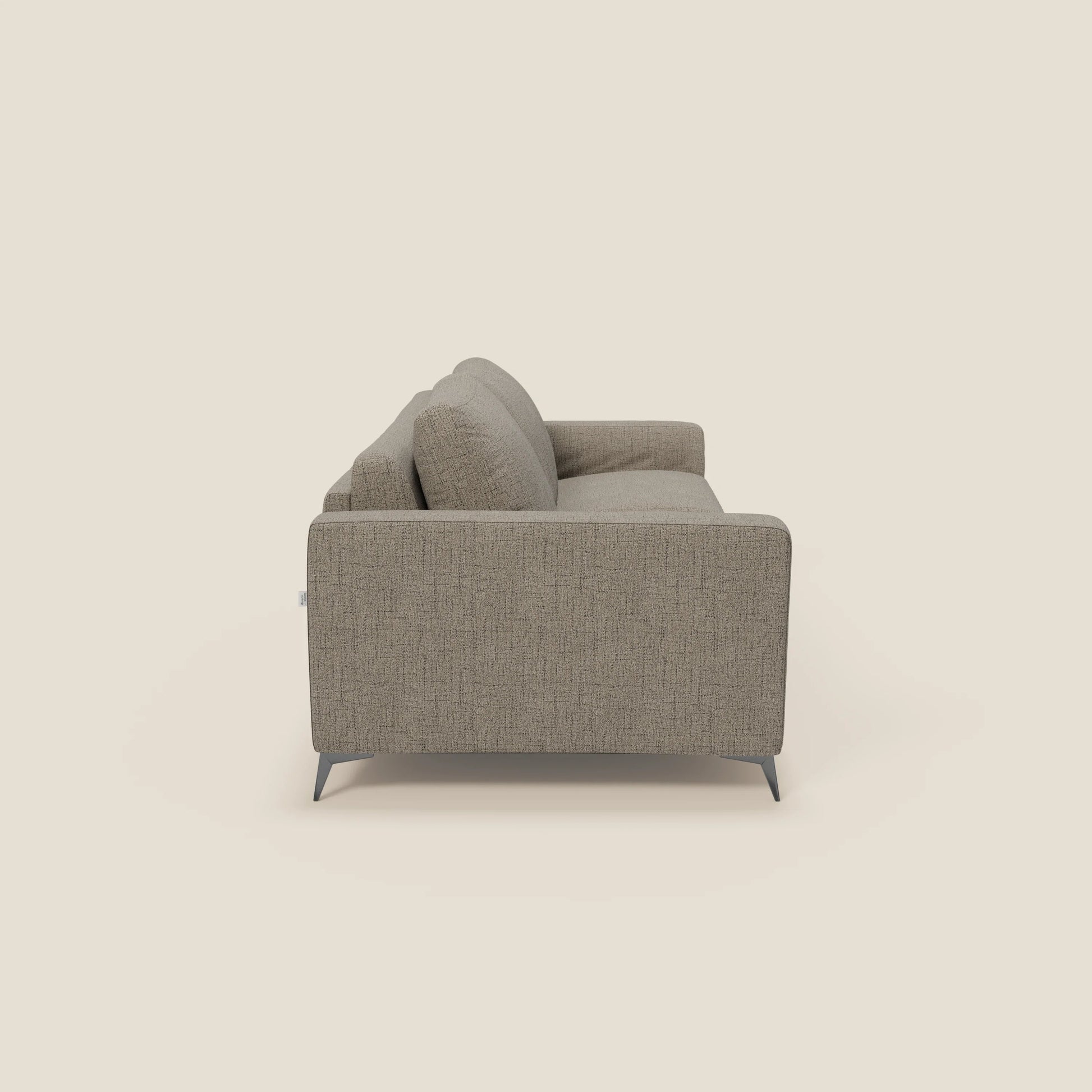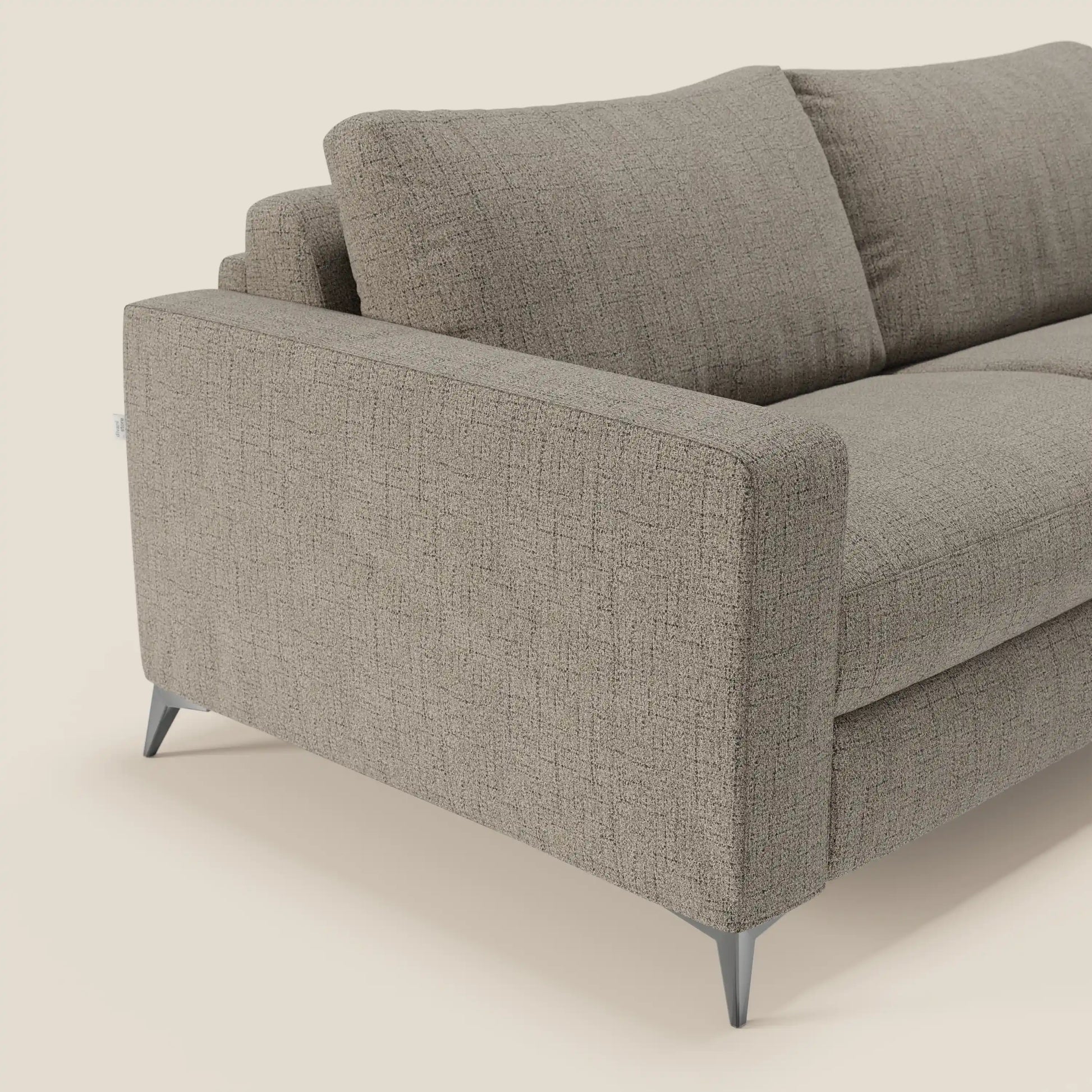 Il divano letto Alaya colpisce al primo sguardo per il suo design essenziale e raffinato : linee dritte, volumi ben proporzionati e una silhouette asciutta che valorizza ogni spazio, anche il più contemporaneo. I piedini alti 13 cm in acciaio Titanio Dark donano al modello un aspetto slanciato e leggero , perfetto per ambienti minimal o dal gusto moderno. La sua estetica pulita si abbina facilmente a diversi stili d'arredo, anche grazie alla possibilità di personalizzazione completa del rivestimento .