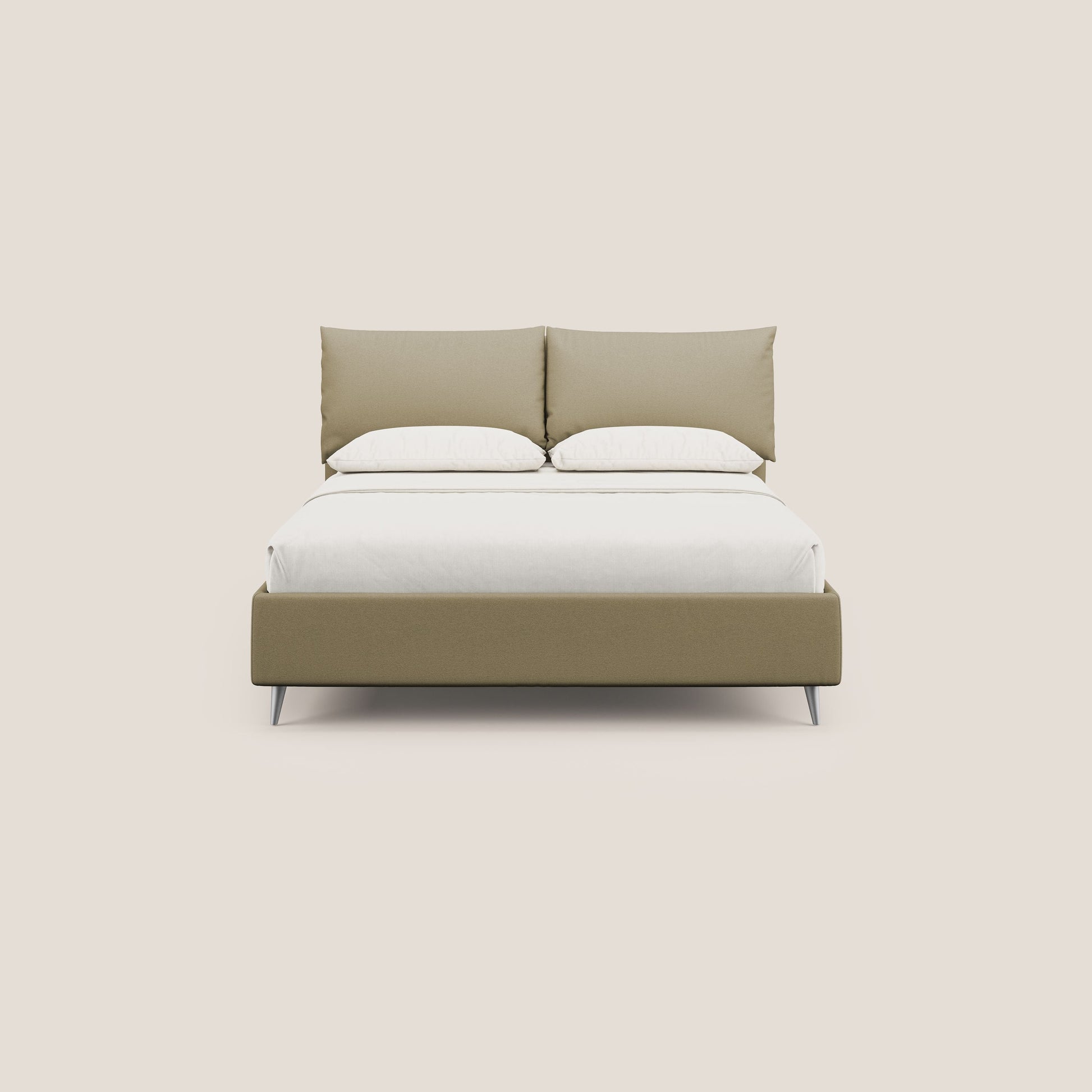 La lavorazione dei cuscini, simbolo di alta tappezzeria e cura dei dettagli , si abbina armoniosamente ai piedini alti 13 cm in policarbonato color alluminio , che assicurano facilità di pulizia e aggiungono un tocco di leggerezza visiva, ideale per ambienti di dimensioni contenute. Il letto, profondo solo 202 centimetri nella versione per materasso da 190 cm , è progettato per massimizzare lo spazio senza sacrificare stile e comfort.
