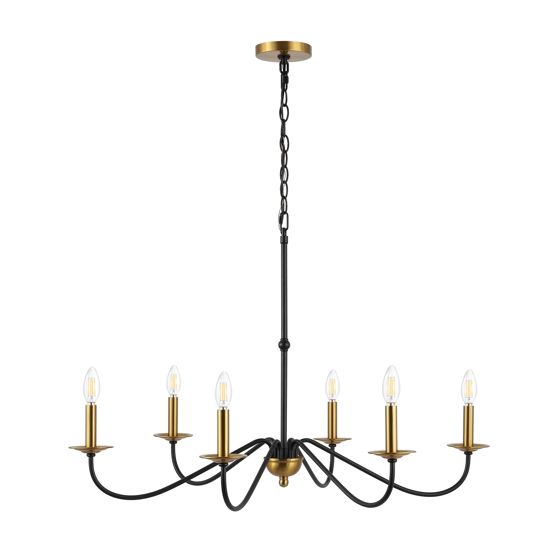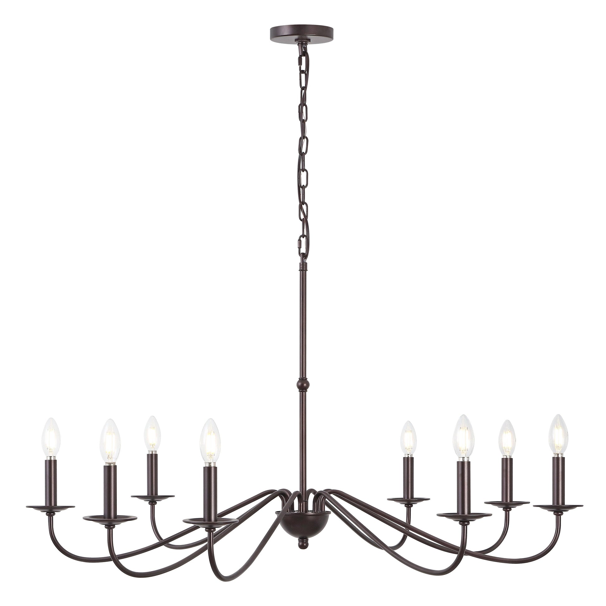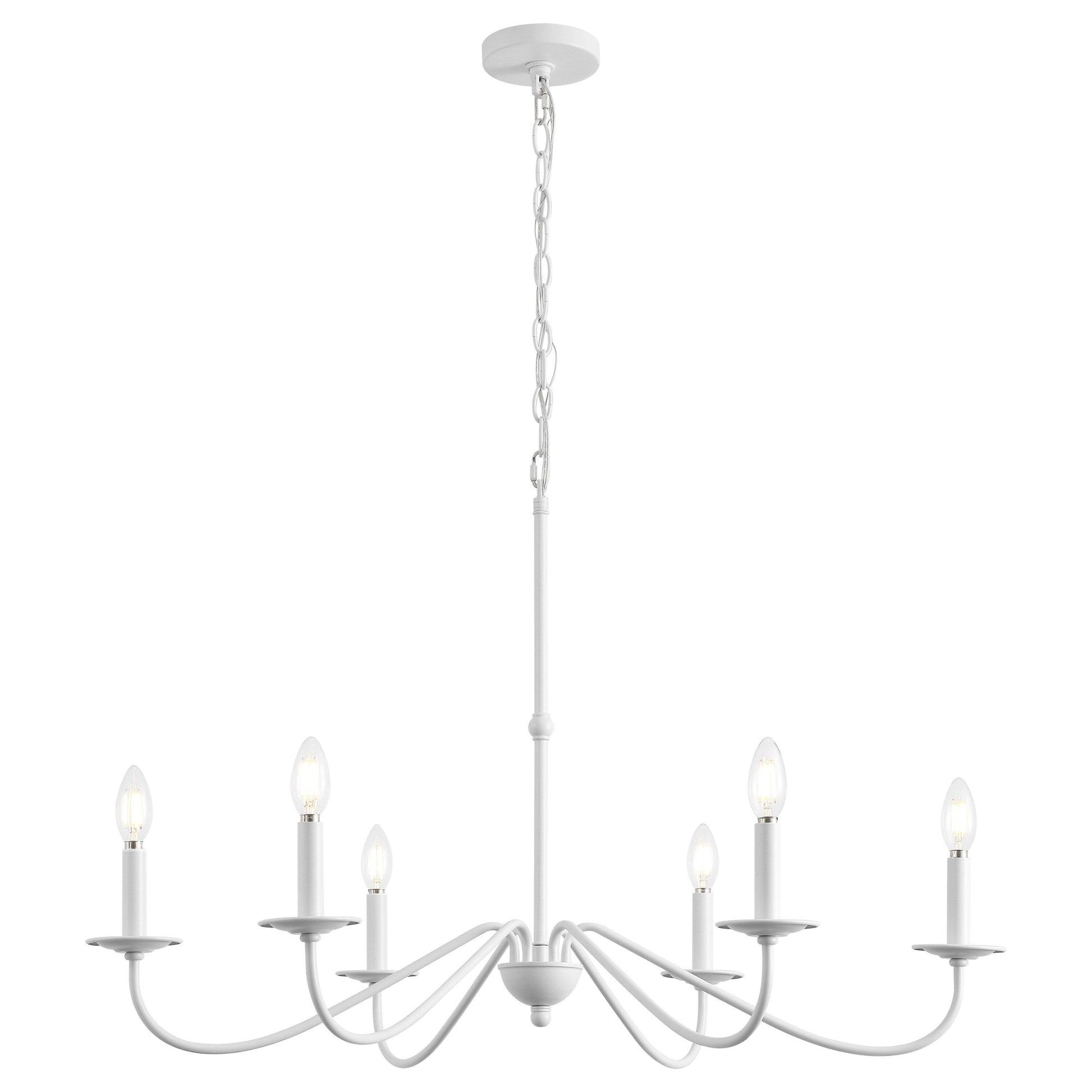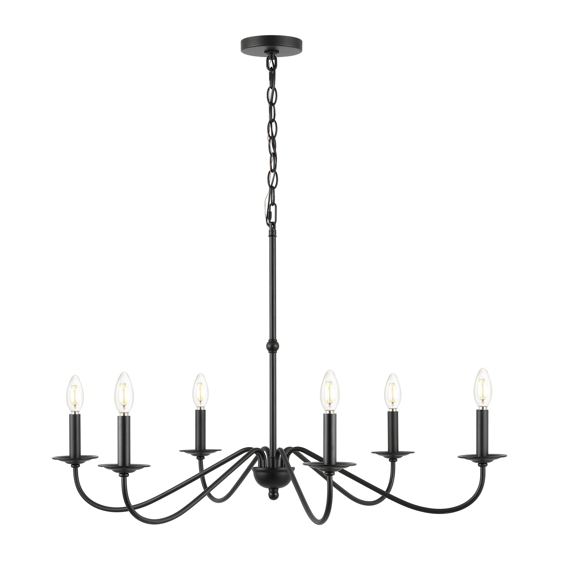 Based on historic wrought iron chandeliers, our rustic 6-light design features a quality finish. Perfectly sized for a farmhouse dining room, tall entry, or great room with high ceilings, our chandelier is just under 35' wide and features tall candles with LED candle bulbs. Use this versatile chandelier in a modern farmhouse, French country or Tuscan style home, or to add character to a rustic, industrial space.
