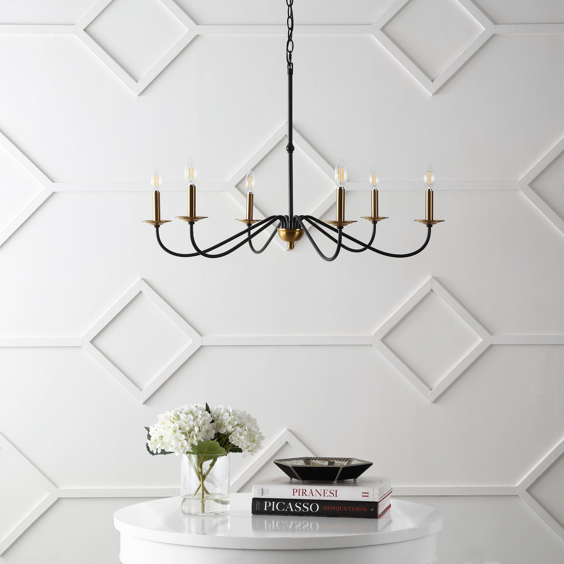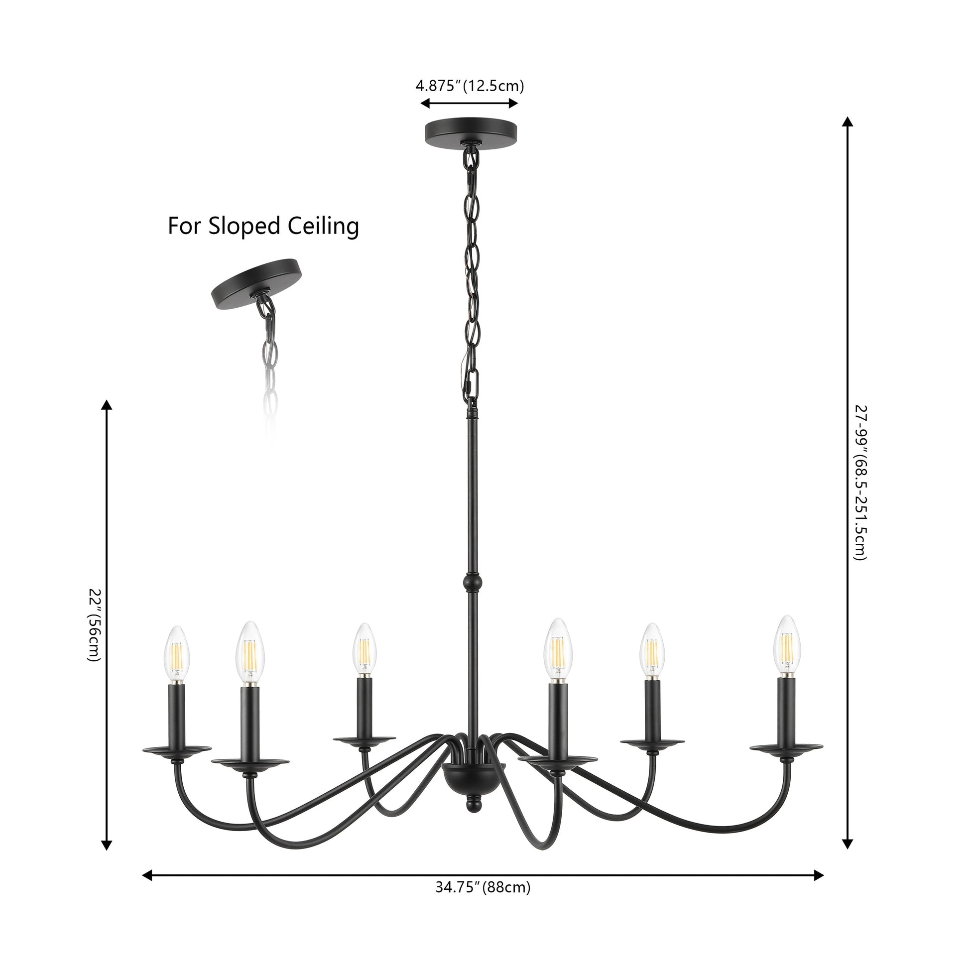• Adjustable-height chandelier works best for ceilings up to twelve feet high