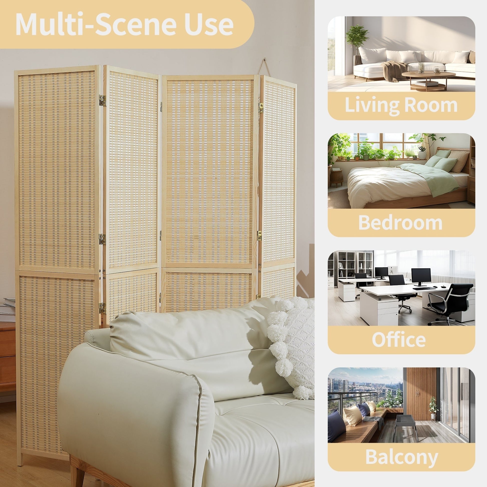 Our stylish bamboo room divider screen is lightweight and foldable for easy storage. The portable freestanding wall partition can be disassembled in half for added space savings and features premium, eco-friendly bamboo. This partition separator effectively blocks light and provides privacy, making it perfect for creating a peaceful environment. The sturdy double hinge folding screen is ideal for living rooms, offices, or public spaces, it comes in 4 or 6 panels, offering versatile room shaping and space separation.